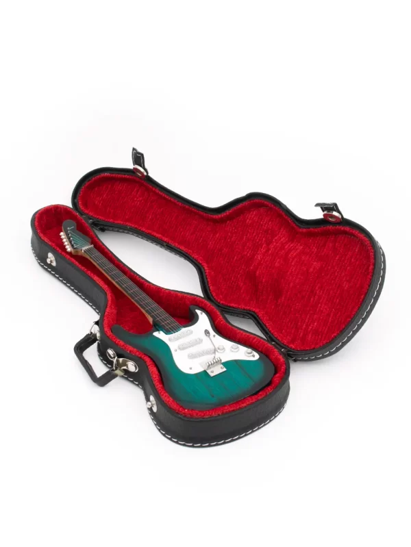 Guitarra eléctrica Material: Madera Medida: 23 cm Medida del estuche: 27 cm Color:Turquesa Nota: El fondo del estuche puede variar de color.