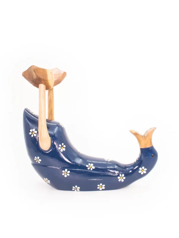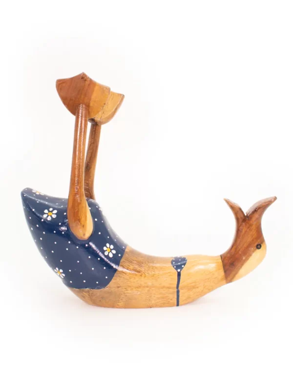 Porta botella Material: Madera Medida: 25x30 cm Forma: Pato Diseño: Azul con flores blancas