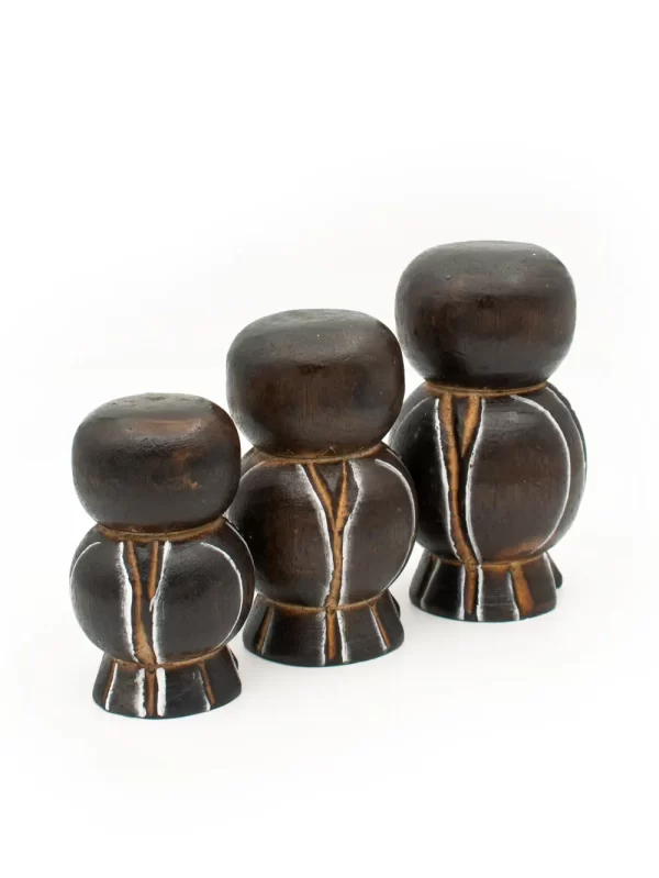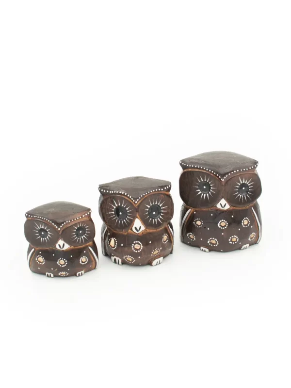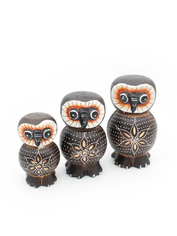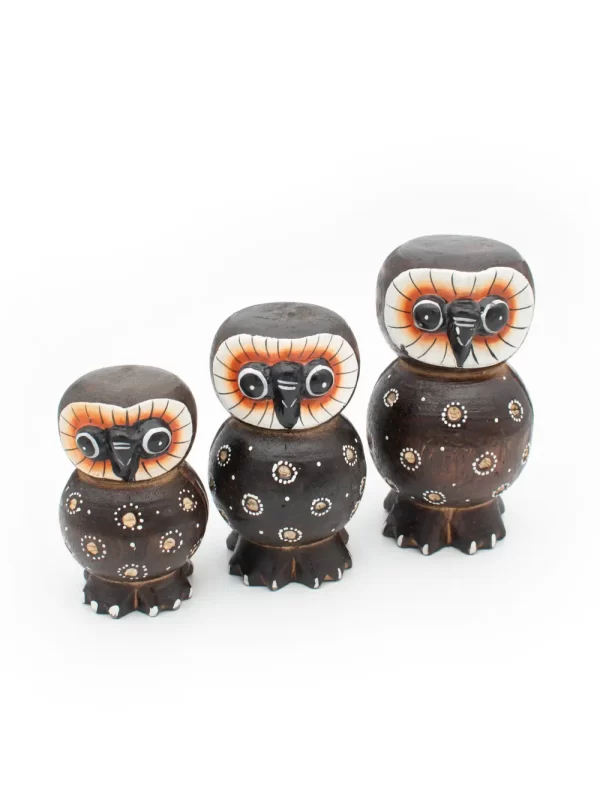 Set de Búhos Material: Madera Medida: 7, 8, 10 cm Forma: Búho Diseño: Puntillismo Color: Marron