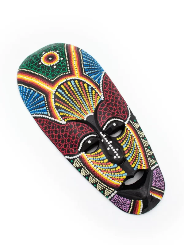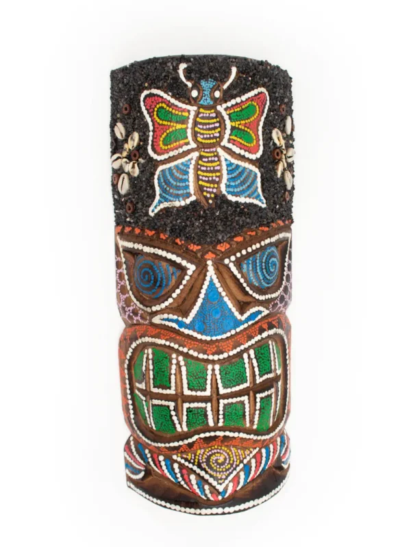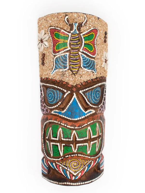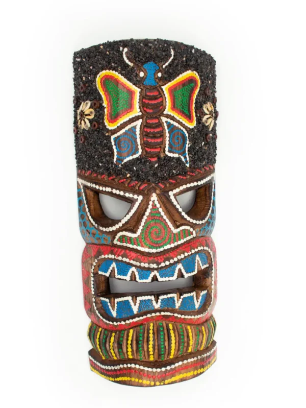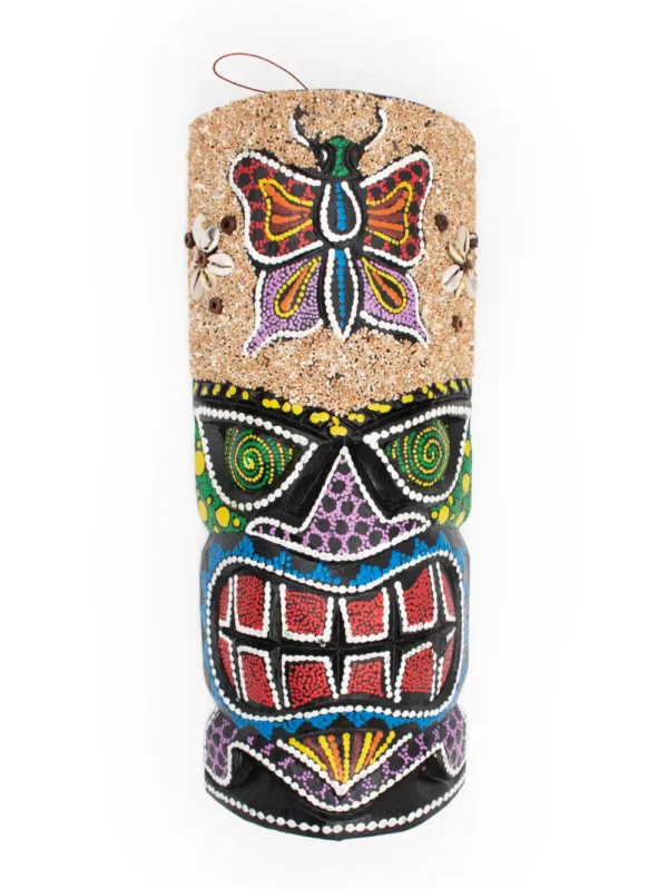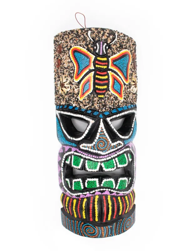 MÁSCARA TIKI CON ARENA Y PINTADO PUNTILLISMO