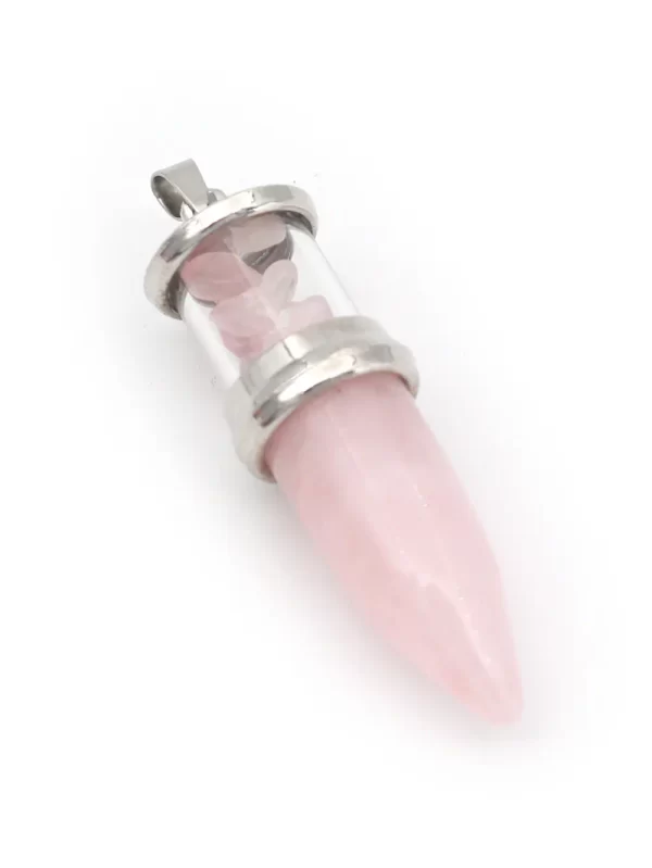 DijePiedra:Cuarzo RosaMedida:1.5 cm x 5cmForma:Pendulo