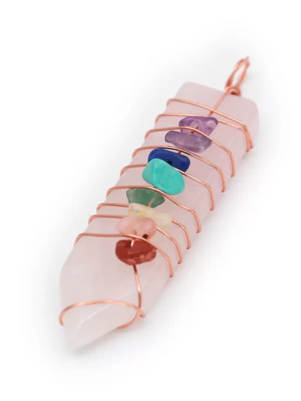 DIJE DE PIEDRA CUARZO ROSA PUNTA HEXAGONAL Y LAS 7 CHACKRAS