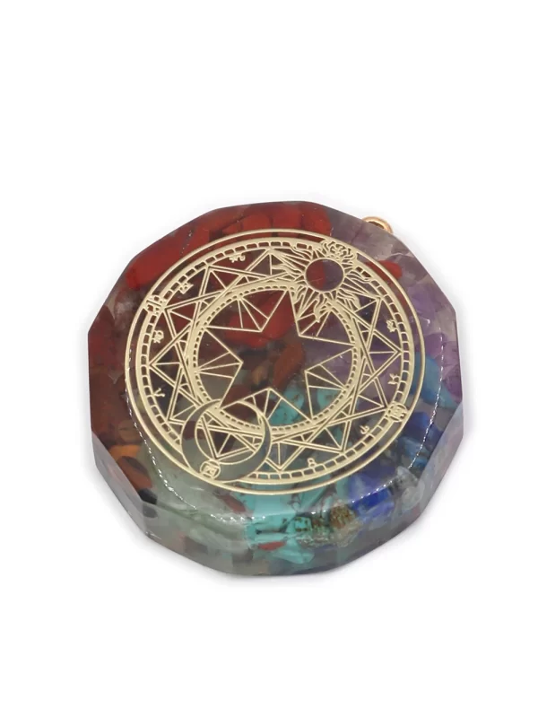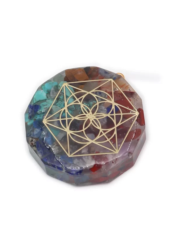 Dije de piedra Piedra: 7 chackras Medida: 3cm Forma: Flor de la vida