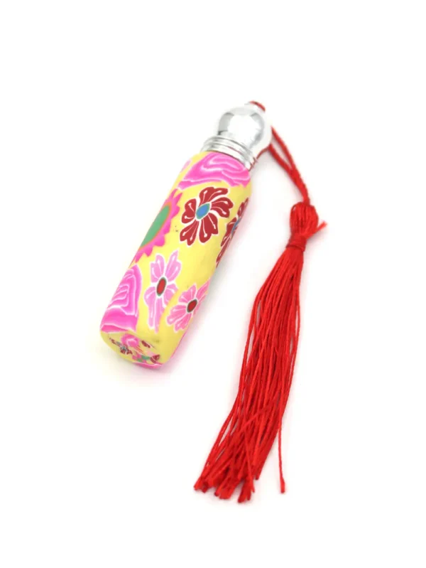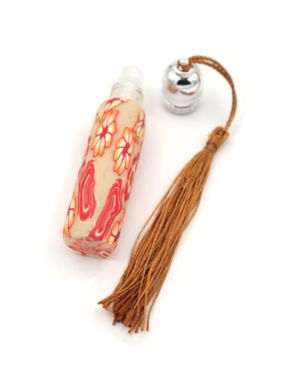 PERFUMERO DE VIDRIO CON DISEÑO DE FLORES Y BORLA ROJO1
