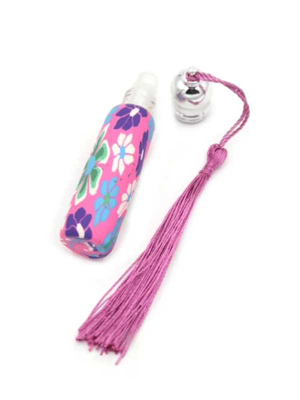 PERFUMERO DE VIDRIO CON DISEÑO DE FLORES Y BORLA ROSADA