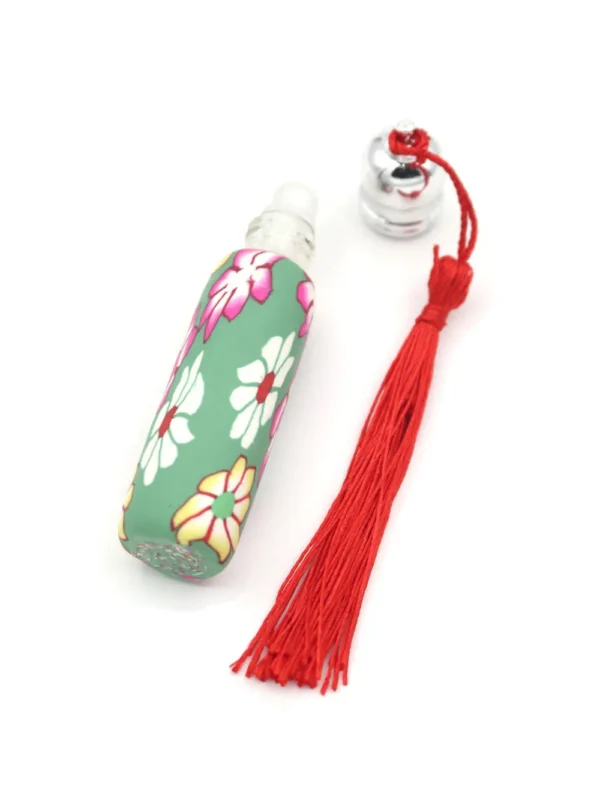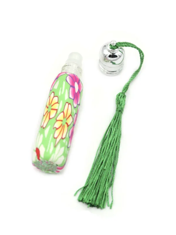 PERFUMERO DE VIDRIO CON DISEÑO DE FLORES Y BORLA VERDE