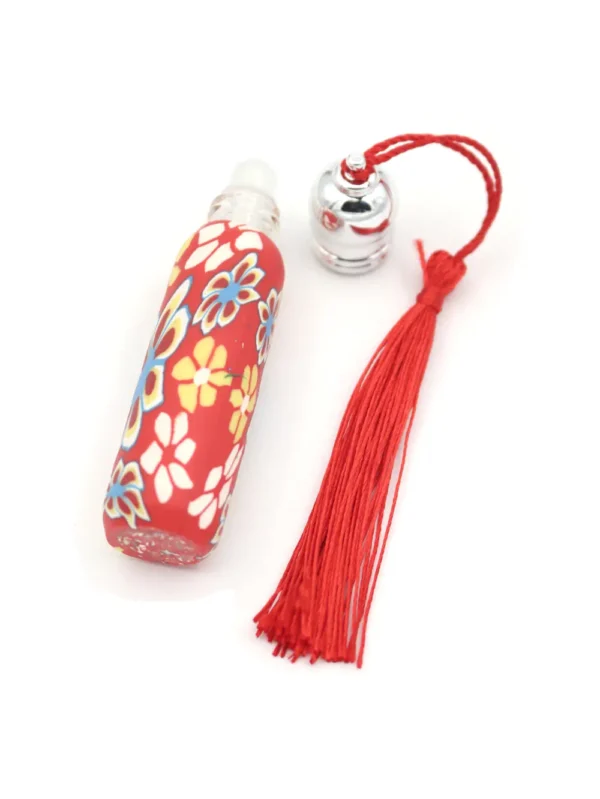 PERFUMERO DE VIDRIO CON DISEÑO DE FLORES Y BORLA ROJO2