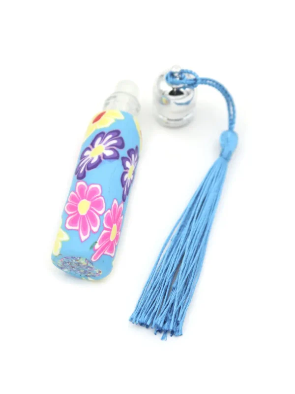 PERFUMERO DE VIDRIO CON DISEÑO DE FLORES Y BORLA CELESTE