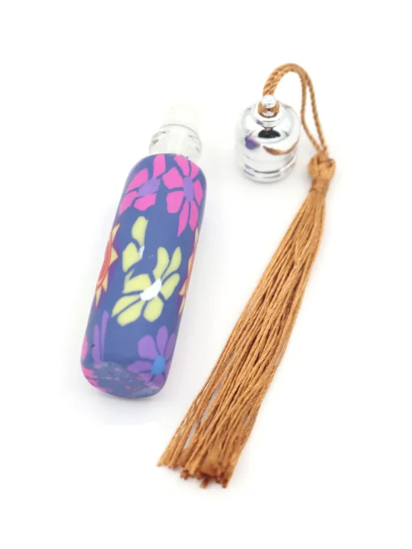 PERFUMERO DE VIDRIO CON DISEÑO DE FLORES Y BORLA MARRON1