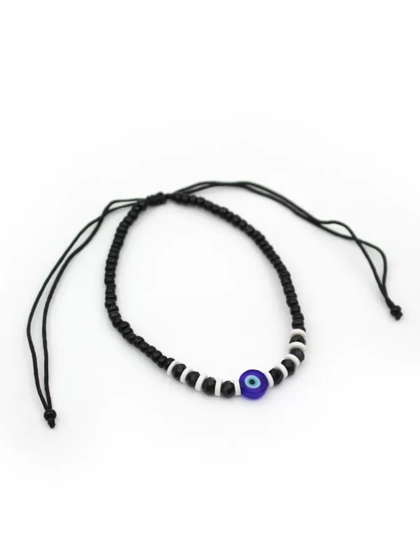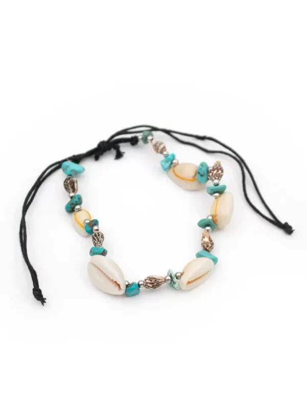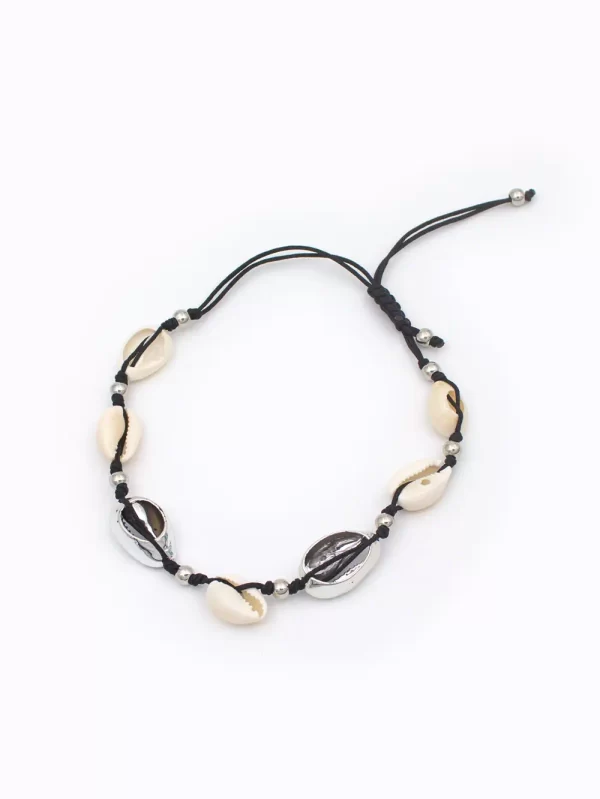 Tobillera Material: Hilo artesanal y caracol marino Color: Negro con caracol blanco y plateado