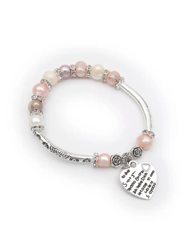 PULSERA ELÁSTICA DE METAL CON PERLAS NATURALES DE AGUA DULCE Y DIJE DE CORAZÓN
