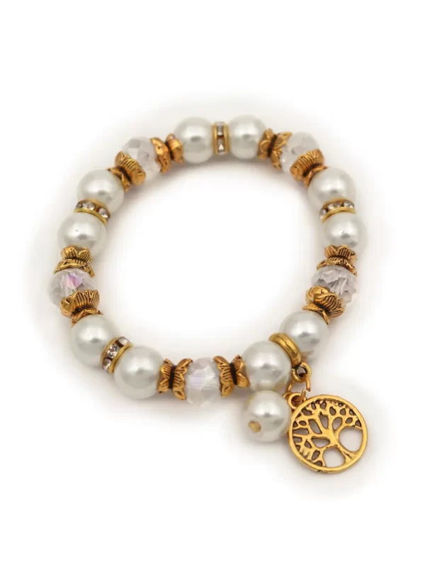 PULSERA ELASTICA CON PERLAS, PLASTIMETAL DORADO Y DIJE ARBOL DE LA VIDA