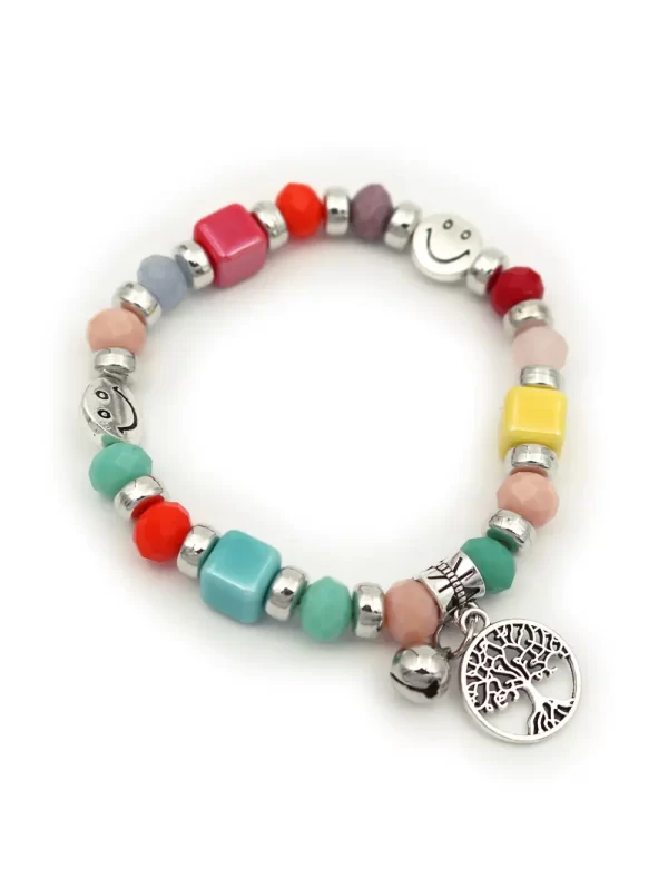 PULSERA ELASTICA CON MURANO DE COLORES, MOSTACILLAS DE METAL Y DIJE ARBOL DE LA VIDA