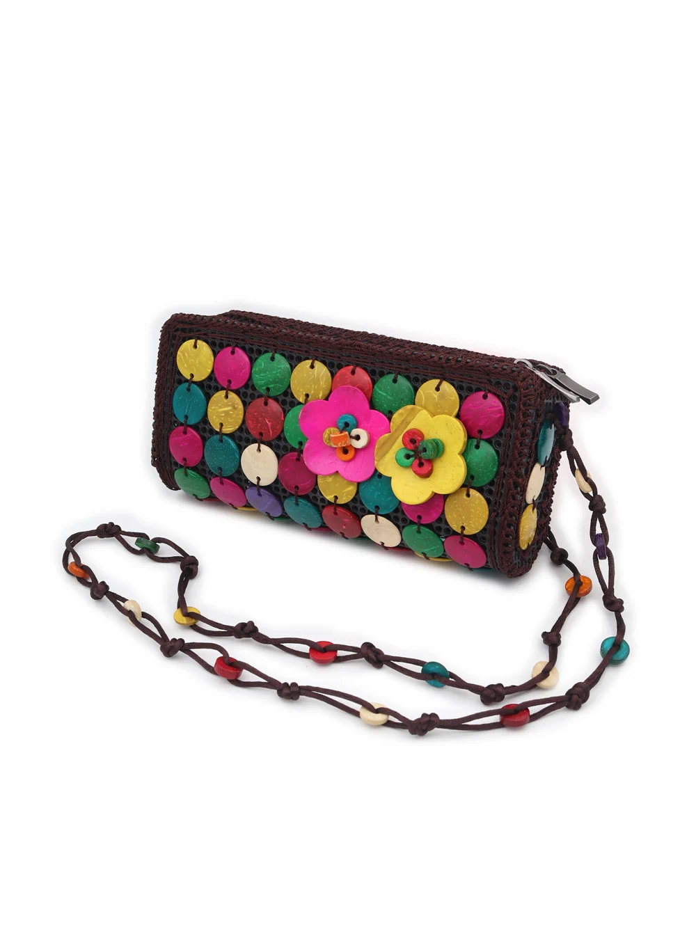 BOLSO DE MANO MARRON CON DISEÑO MULTICOLOR CON 2 FLORES ROSA Y AMARILLO