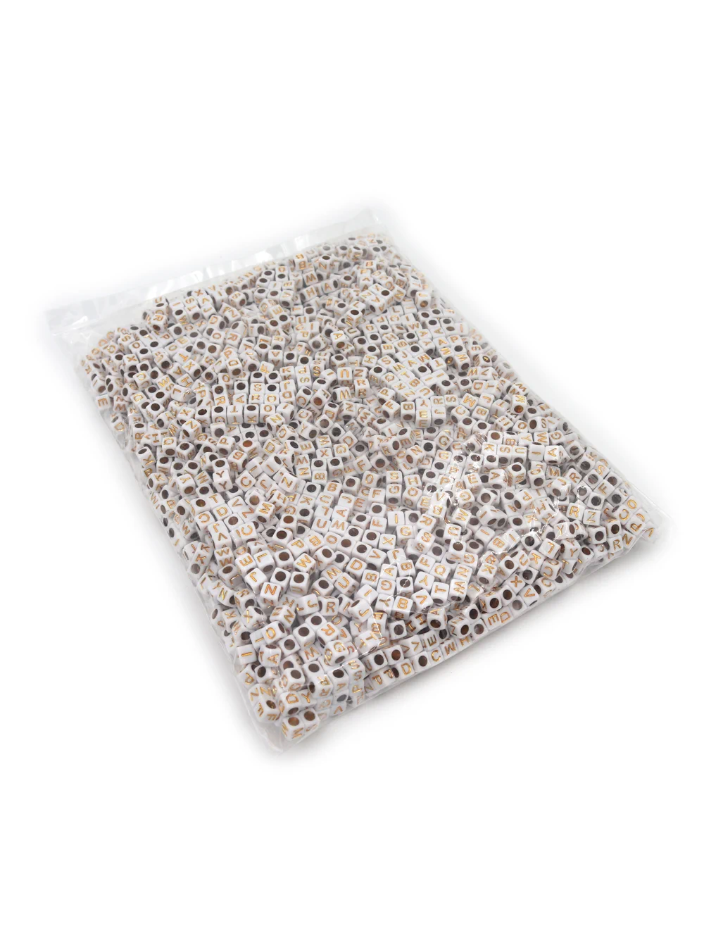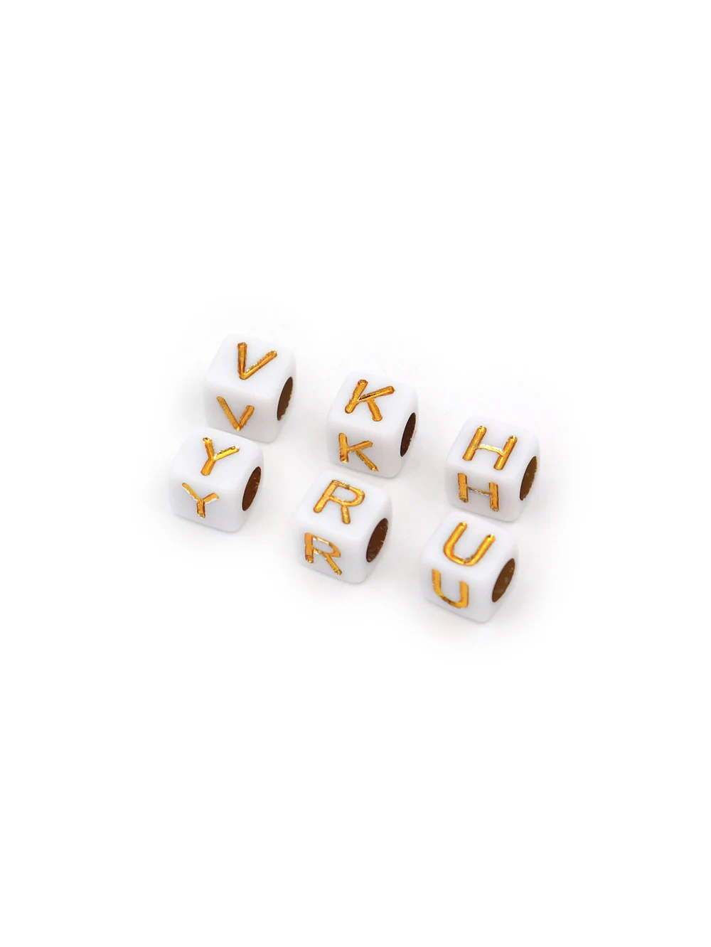 Cuentas de letras Material: Acrílico Forma: Cubo Color: Fondo blanco y letras doradas