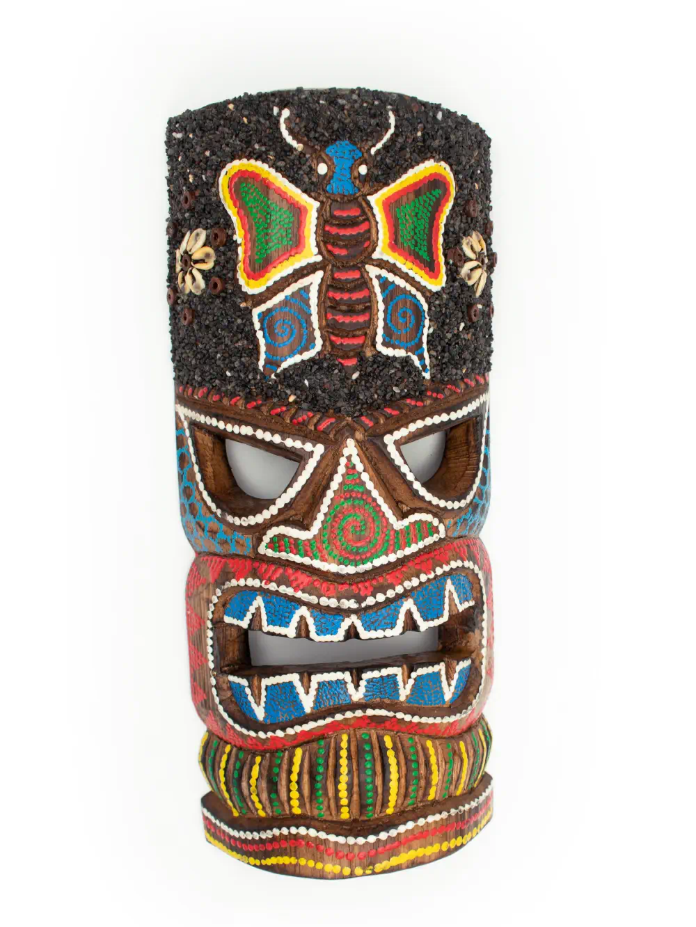 p>La máscara Tiki de madera con arena y pintado en técnica de puntillismo es una pieza decorativa única que aporta personalidad y energía a cualquier ambiente. Inspirada en la cultura polinesia, esta máscara representa fuerza, protección y conexión espiritual, convirtiéndose en un símbolo ancestral lleno de significado.