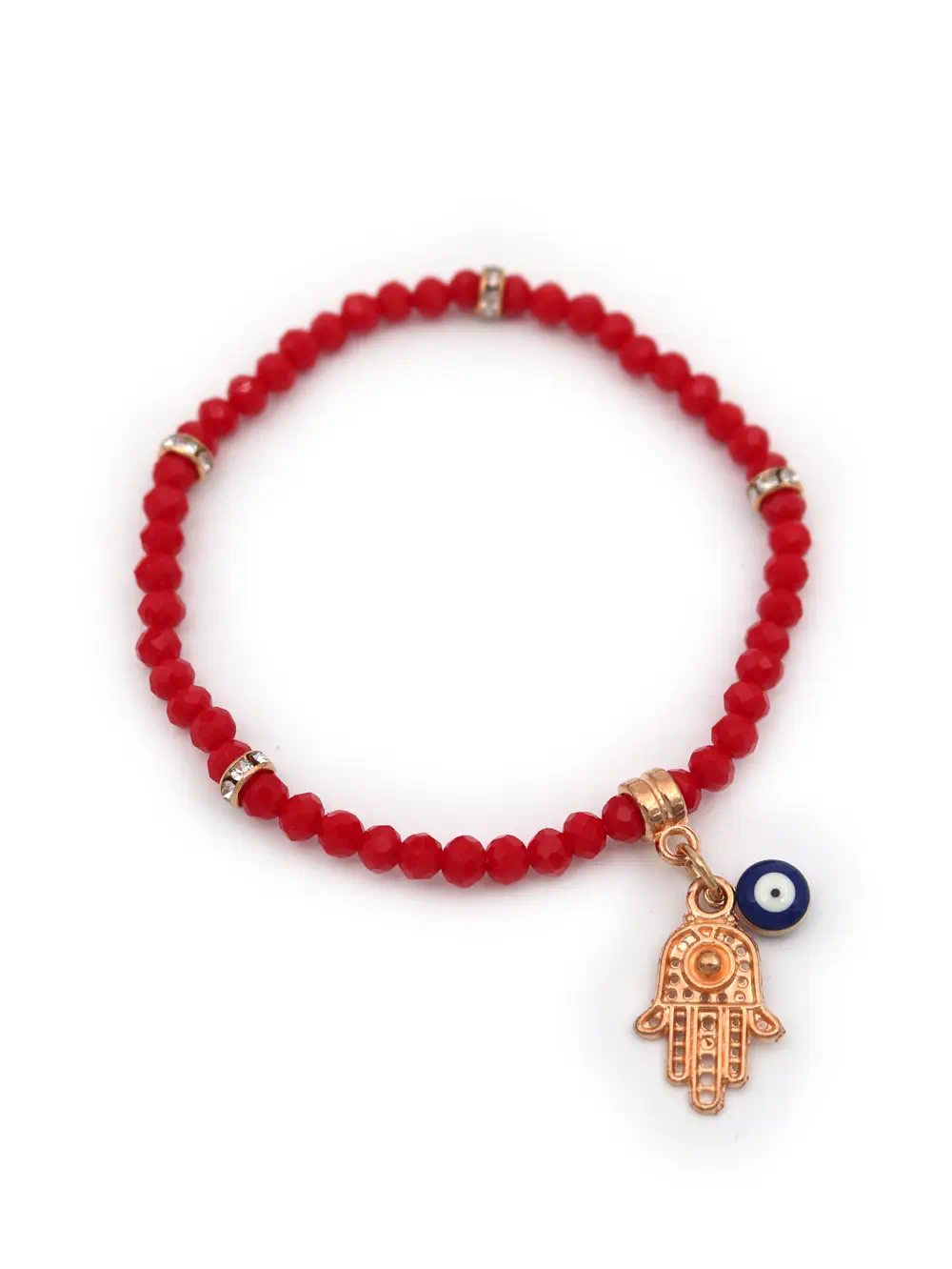 PULSERA ELASTICA CON MURANO DE COLOR ROJO, MOSTACILLA DORADA Y DIJE MANO DE FATIMA