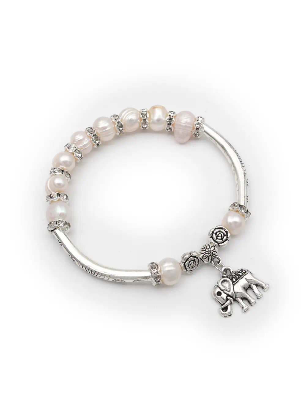 Pulsera Elástica de Metal con Perlas Naturales y Dije de Elefante