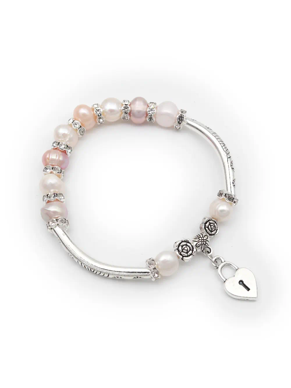 PULSERA ELÁSTICA DE METAL CON PERLAS NATURALES DE AGUA DULCE Y DIJE DE CORAZÓN
