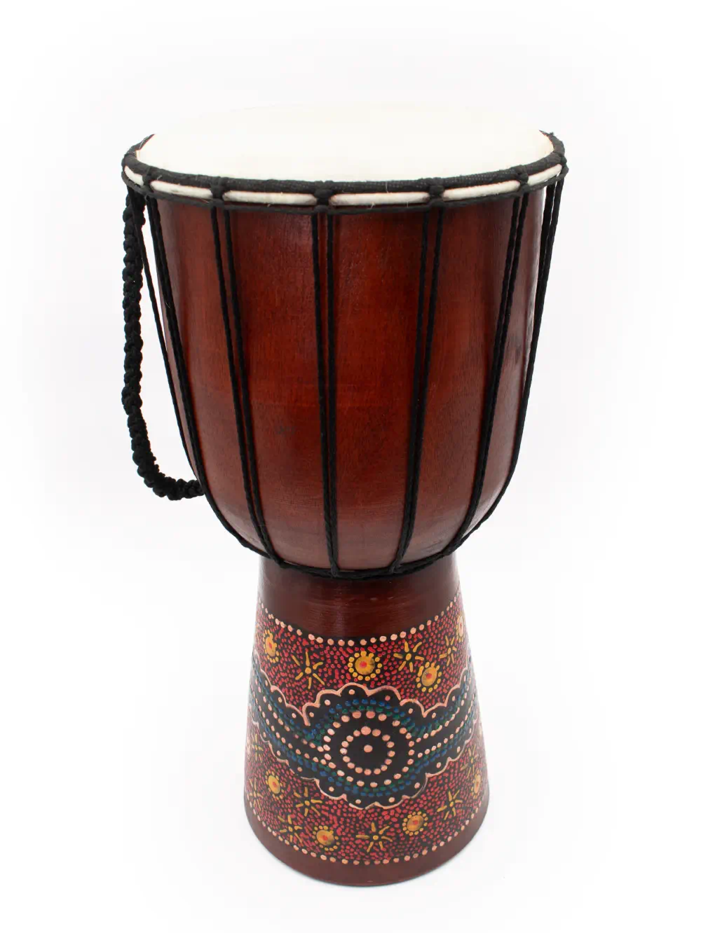 Además de su funcionalidad, este tambor Djembe destaca por su diseño artístico, decorado con patrones de puntillismo que combinan colores vivos y formas geométricas. Cada pieza es única y refleja un trabajo artesanal que agrega un toque estético excepcional, ideal para quienes aprecian la belleza del arte en los instrumentos musicales.